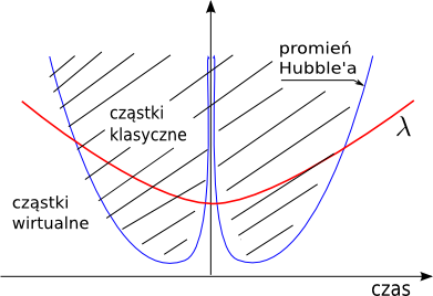 Jak jednak ten metaforyczny obraz ma się do rzeczywistości fizycznej? Postaram się to teraz wyjaśnić. Istota tkwi w tym, że wszystkie zdarzenia zachodzące w obrębie horyzontu podlegają przyczynowej zależności. Obszary układu którego elementy nie są w takiej koneksji nie podlegają ewolucji, w przeciwieństwie do obszarów podhoryzontalnych. Wyobraźmy sobie proces jakim jest fala. Fala o długości podhoryzontalej podlega ewolucji rządzonej równaniem falowym. Jeśli jednak długość fali przekroczy promień horyzontu, zacznie dziać się coś bardzo ciekawego. Mianowicie, fala przestanie ewoluować, w żargonie mówi się, że “zamarza”. Jest to naturalną konsekwencją braku wzajemnego oddziaływania podukładów. Jeśli zamarza woda to nie mogą się na niej rozchodzić fale powierzchniowe. Natomiast sama fala, jeśli istniała przed zamarznięciem, może pozostać w formie skrystalizowanej. Tak samo jest w przypadku fal przecinających horyzont kosmologiczny. Fale, o których mowa to tak zwane mody drgań pól. W szczególności, jeśli rozważymy pole kwantowe, fale takie odpowiadają fluktuacjom próżni. Fale te nieustannie tworzą się i znikają, przestrzegając przy tym zasadę nieoznaczoności Heisenberga. Mody te nazywamy cząstkami wirtualnymi. Jeśli jednak dany mod przetnie skalę horyzontu, ulegnie “zamrożeniu” i stanie się klasyczną cząstką. Idea ta jest podstawą mechanizmu kosmologicznej kreacji cząstek. Jak jednak mechanizm ten ma się do idei testowania kwantowej fazy Wszechświata? Popatrzmy na rysunek poniżej.