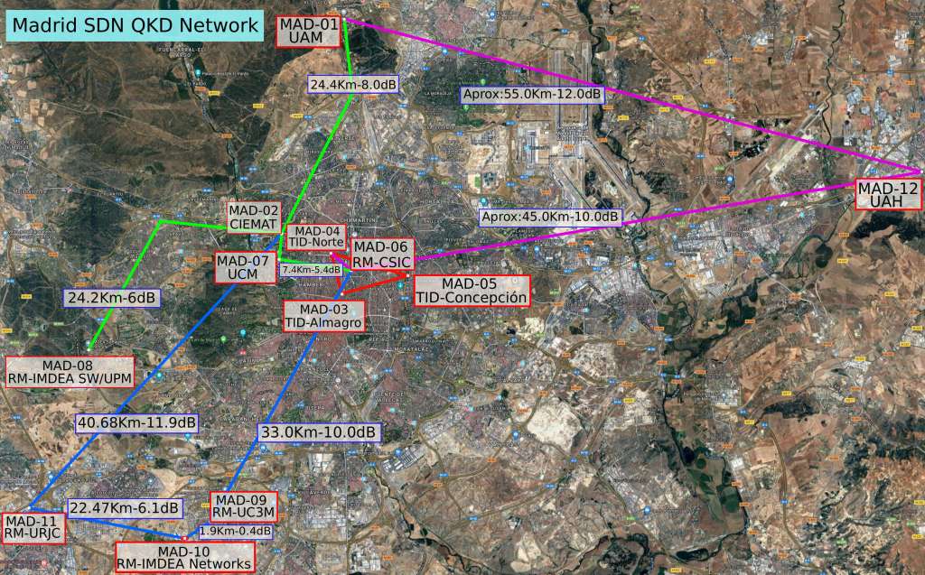 Zarówno Stany Zjednoczone, jak i Unia Europejska (czy też inne rozwinięte technologicznie państwa) nie pozostają bierne i również prowadzą prace nad budową własnych kwantowych sieci. Na naszym europejskim podwórku, na szczególną uwagę zasługuje eksperymentalna kwantowa sieć miejska zbudowana w Madrycie. Sieć ta powstała we współpracy naukowców z Politechniki madryckiej oraz firm Telefonica i Huawei. Dostawcą systemów do kwantowej dystrubucji klucza jest tutaj niemiecki oddział firmy Huawei, natomiast Telefonica do celu projektu udostępnia swoje zasoby sieciowe. Madrycka sieć, której schemat przedstawiono poniżej, zawiera obecnie 13 połączeń i należy do najbardziej rozbudowanych tego typu sieci na świecie.