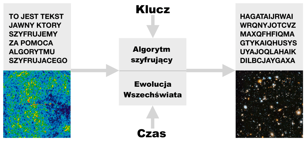 Jednak wciąż brakuje nam klucza. W naszej kosmicznej analogii jest nim przede wszystkim czas. To on mówi nam, ile podstawowych kroków szyfrujących trzeba wykonać. A musimy to wiedzieć, jeśli chcemy odzyskać stan początkowy. Nie znając klucza, musimy próbować z różnymi jego wartościami. W tym jednak zarówno krypktoanalitycy, jak i kosmolodzy są zaprawieni. Łamacze szyfrów zaprzęgają superkomputery, które sprawdzają wszystkie dopuszczalne wartości. To mało wyrafinowane podejście określa się mianem ataku siłowego. Igły w stogu siana szukają także kosmolodzy-teoretycy, analizujący ewolucję kosmologiczną dla różnych modeli, różnych wartości parametrów i różnych czasów. Oczywiście z niesłabnącą nadzieją na “szczęśliwy traf”.